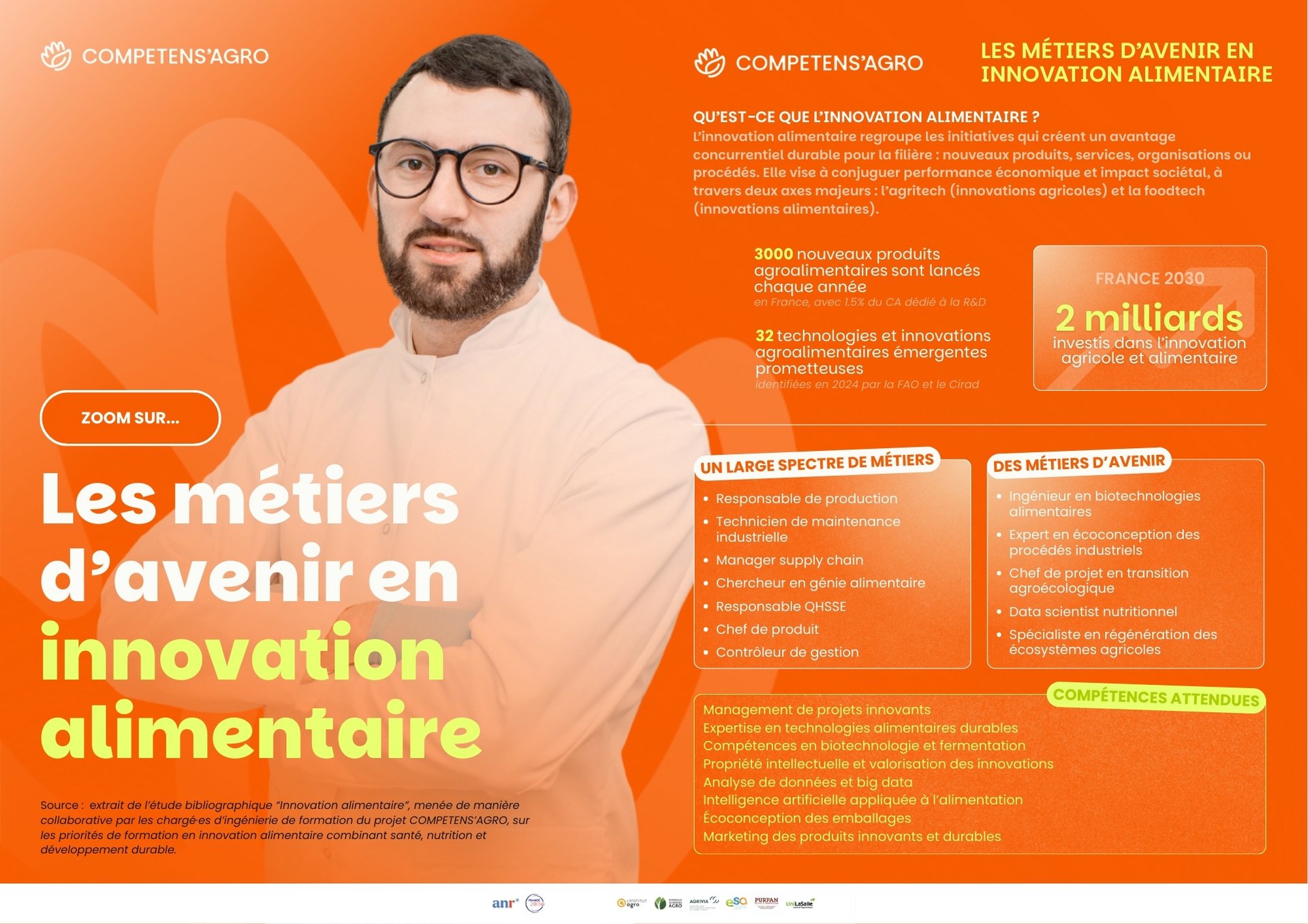 Dans le cadre de sa mission de développement de la formation tout au long de la vie, COMPETENS'AGRO a réalisé cette étude bibliographique sur l'innovation alimentaire. Ce travail collaboratif, conduit par les chargé.e.s d'ingénierie de formation, met en lumière les tendances et technologies émergentes, les métiers en évolution ainsi que les compétences clés attendues dans les prochaines années.
